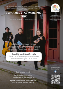 Sans titre Trouver les Évènements Navigation par l'affichage des événements Options d'affichage Liste Mois Jour Jour du Évènements pour 9 avril 2026 Navigation par jour « Jour précédent Jour suivant » 19 h 00 min Concert du Stimmung Trio avril 9 à 19 h 00 min - 21 h 00 min Eglise luthérienne Saint-Marcel, 24 rue Pierre Nicole Paris, 75005 France Voir les détails » + Exporter Évènements du jour